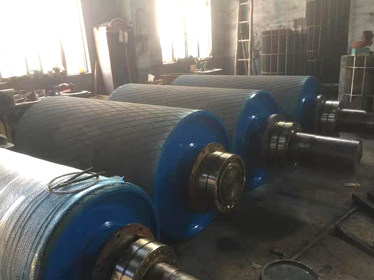 傳動(dòng)滾筒是輸送機(jī)傳遞動(dòng)力的部件。傳動(dòng)滾筒表面有裸露光鋼面,人字形和菱形花紋橡膠覆面。小功率、小帶寬及環(huán)境干燥時(shí)可采用裸露光鋼面。人字形花紋膠面摩擦系數(shù)大,防滑性和排水性好,但有方向性。菱形膠面用于雙向運(yùn)行的輸送機(jī)。